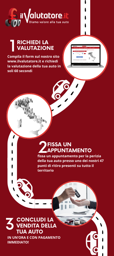 Inoltrata la richiesta, un nostro esperto revisionerà la tua scheda di valutazione auto in poche ore ed invierà direttamente sulla tua casella email una valutazione autentica e realistica, per la quale, a condizione che il mezzo sia in perfetto stato d'uso, Il Valutatore s'impegna a ritirare la tua auto usata con modalità di pagamento immediato. Esatto! Puoi valutare la tua auto adesso ed avere il denaro sul conto corrente domani.